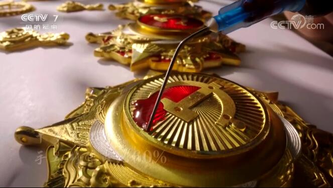 黨和國家勛獎(jiǎng)?wù)略O(shè)計(jì)制作團(tuán)隊(duì)成員 宮占坤:我們拔出來這絲都是在0.25毫米,也就是三根頭發(fā)絲的粗度。純手工比機(jī)器紡的花絲效果會(huì)更好,為了百年的勛章做到最完美,所以說我們采用的這個(gè)手工制作方法。