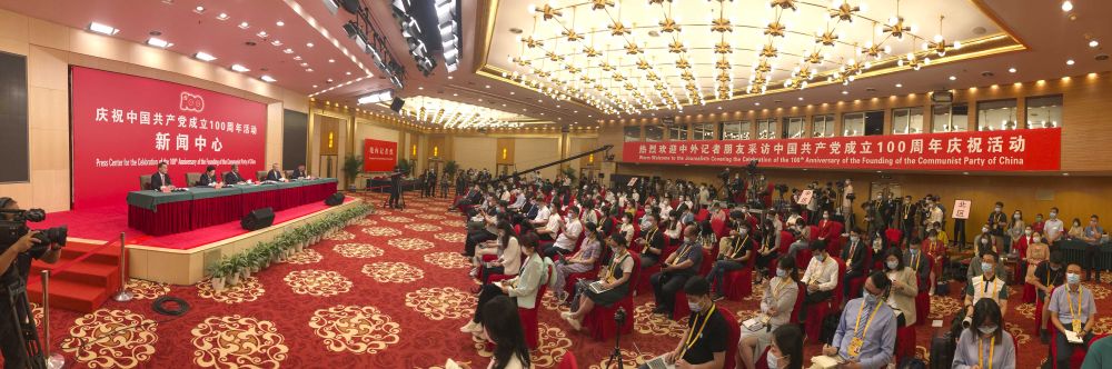 6月28日,慶祝中國(guó)共產(chǎn)黨成立100周年活動(dòng)新聞中心舉辦第二場(chǎng)新聞發(fā)布會(huì),中央紀(jì)委副書記、國(guó)家監(jiān)委副主任肖培,中央統(tǒng)戰(zhàn)部副部長(zhǎng)許又聲,中央對(duì)外聯(lián)絡(luò)部副部長(zhǎng)郭業(yè)洲,中央財(cái)辦分管日常工作的副主任韓文秀結(jié)合各部門工作職能介紹情況,并回答了記者提問(wèn)。這是發(fā)布會(huì)現(xiàn)場(chǎng)(手機(jī)全景照片)。新華社記者 殷剛 攝