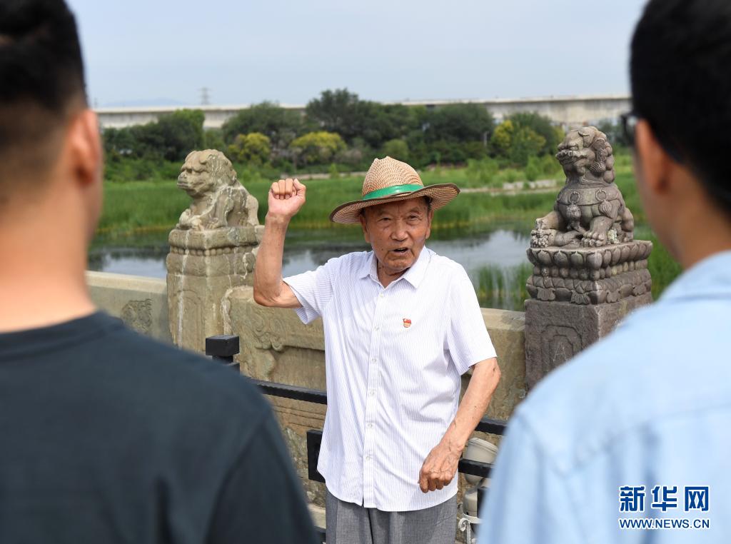 7月5日,鄭福來(lái)老人在北京盧溝橋?yàn)橛慰椭v述抗戰(zhàn)歷史。新華社記者 張晨霖 攝 頭頂遮陽(yáng)帽,漫步盧溝橋,觸摸石獅子,作為“七七事變”的親歷者,90歲的“光榮在黨50年”紀(jì)念章獲得者、“時(shí)代楷?!睒s譽(yù)獲得者鄭福來(lái)老人,為了讓后人銘記那段刻骨銘心的歷史,仍堅(jiān)持在炎炎夏日中,向來(lái)往的游客介紹他眼中的抗戰(zhàn)故事。 84年前,“七七事變”爆發(fā),中華民族遭受了前所未有的劫難?!拔彝辽灵L(zhǎng)在盧溝橋,一輩子就生活在這兒?!咂呤伦儭臅r(shí)候我6歲,那時(shí)慘烈的景象我到現(xiàn)在還記憶猶新?!编嵏?lái)站在橋中央遠(yuǎn)眺著宛平城門(mén)回憶道,那個(gè)晚上,他在密集的槍炮聲中驚醒?!拔壹揖妥≡诒R溝橋西,離那兒不足50米。那天晚上,震耳欲聾的炮彈聲差不多響了一宿。頭一天還跟我一起玩兒的小伙伴,當(dāng)晚就被落在家門(mén)前的炮彈給炸死了!”