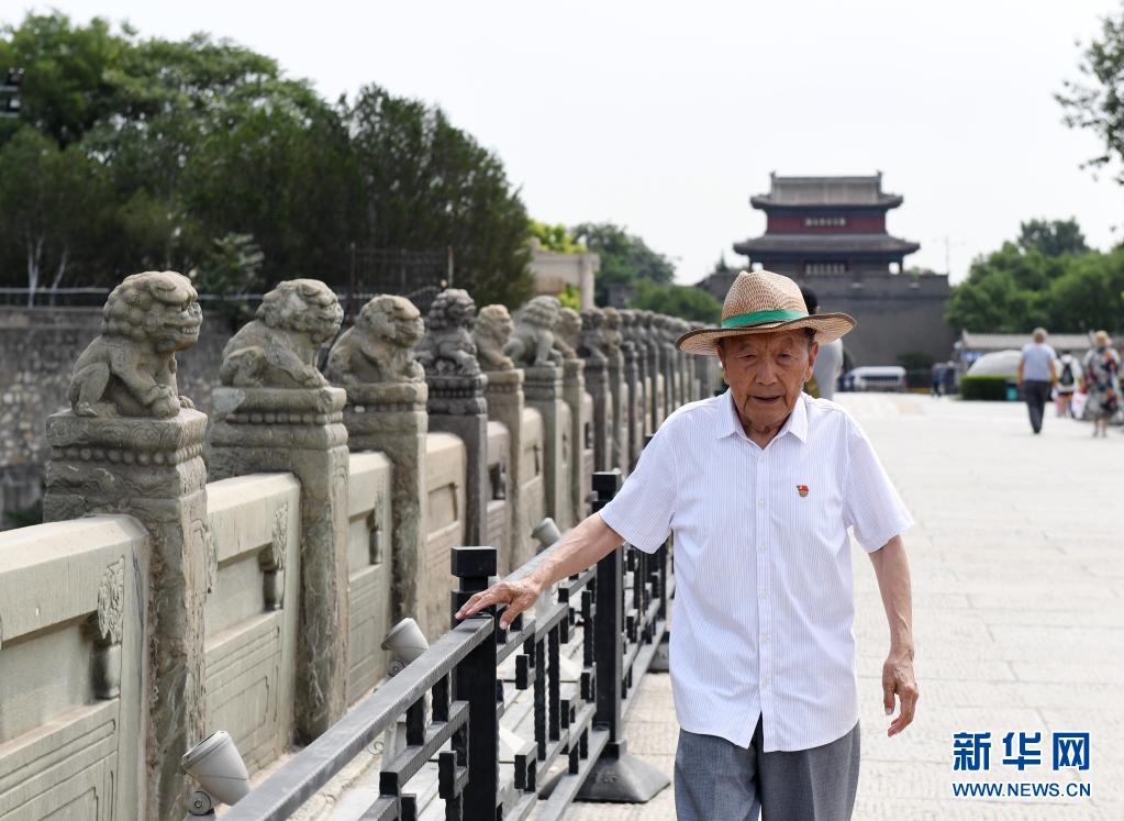 7月5日,鄭福來(lái)老人走在北京盧溝橋上。新華社記者 張晨霖 攝 說(shuō)著過(guò)去的經(jīng)歷,老人聲音有些哽咽?!爱?dāng)時(shí)駐守在盧溝橋附近宛平城的是國(guó)民革命軍第29軍,那晚過(guò)后,很多戰(zhàn)士都犧牲了?!编嵏?lái)說(shuō),就在自己平時(shí)常去玩耍的一小片松樹(shù)林里,擺放了很多戰(zhàn)士的遺體。盡管那時(shí)候他還小,但不屈的抗戰(zhàn)精神早已深深烙在他的腦海里?!皡羌业亩?、任大嘴,還有很多其他鄉(xiāng)親被侵略者殘忍殺害了,盧溝橋和宛平城門(mén)上的彈痕就是見(jiàn)證?!?/p> 受到抗日戰(zhàn)士們英勇氣概的強(qiáng)烈感染,鄭福來(lái)在心中埋下了革命的種子。他18歲參加革命工作,不久后正式加入中國(guó)共產(chǎn)黨,此后還以盧溝橋鎮(zhèn)政府民政委員的身份前往天安門(mén)廣場(chǎng)參加開(kāi)國(guó)大典。從此,他的全部青春完全凝結(jié)在首都的建設(shè)中。1952年當(dāng)選為盧溝橋鎮(zhèn)第一任鎮(zhèn)長(zhǎng),同年接待美國(guó)記者愛(ài)潑斯坦,1959年帶著群眾為首都十大建筑供應(yīng)砂石料……在很多重大歷史的進(jìn)程中,都有他的身影。