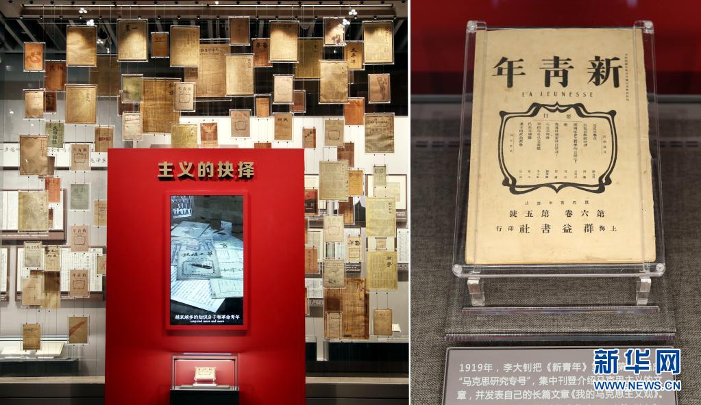 這是6月1日在上海的中共一大紀(jì)念館拍攝的大型立體式視覺置景“主義的抉擇”,100件五四運(yùn)動(dòng)前后傳播馬克思主義、社會(huì)主義的報(bào)紙雜志,錯(cuò)落陳列在玻璃墻上。其中,《新青年》第6卷第5號(hào)“馬克思研究專號(hào)”在前端“高光”展示,這期“專號(hào)”標(biāo)志著馬克思主義在中國的傳播進(jìn)入了較為系統(tǒng)的階段。新華社記者 劉穎 攝