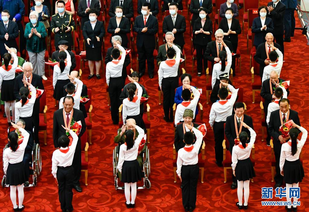 6月29日,慶祝中國共產(chǎn)黨成立100周年“七一勛章”頒授儀式在北京人民大會(huì)堂金色大廳隆重舉行。這是少先隊(duì)員向勛章獲得者獻(xiàn)花,敬禮致意。新華社記者 高潔 攝