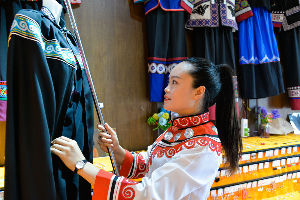 7月15日,在貴州省畢節(jié)市大方縣奢香古鎮(zhèn),彝族姑娘龍恩碧在自己的彝族服飾和手工藝品店整理商品。新華社記者 徐欽 攝 “小龍師傅”就是龍恩碧。盡管年紀(jì)不大,但熟練的技藝早已贏得了大家對她的尊重。 獨具彝族風(fēng)情的奢香古鎮(zhèn)是當(dāng)?shù)刈畲蟮囊椎胤鲐毎徇w安置點,安置了來自大方縣24個鄉(xiāng)鎮(zhèn)的12500余名群眾。大學(xué)畢業(yè)后,龍恩碧原本打算去深圳找工作,但看到家鄉(xiāng)的變化后,堅定了回鄉(xiāng)創(chuàng)業(yè)的想法。