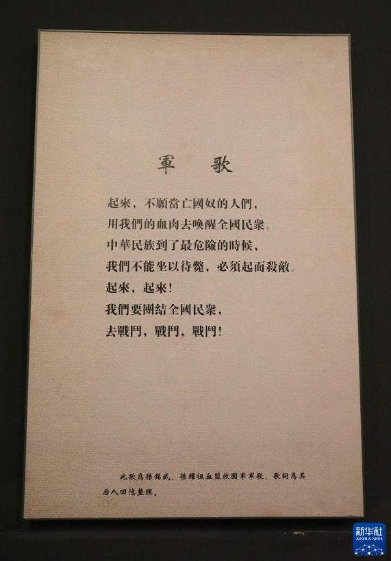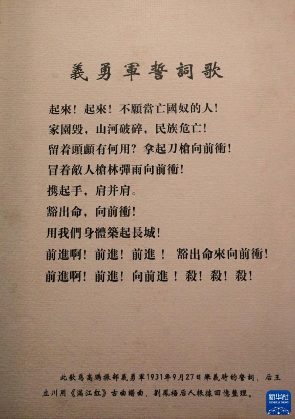 在東北抗日義勇軍紀(jì)念館拍攝的《義勇軍誓詞歌》歌詞(7月21日攝)。新華社記者 蔡湘鑫 攝 北京,中國共產(chǎn)黨歷史展覽館,參觀者絡(luò)繹不絕。其中林海雪原的展陳吸引著人們目光。 “火烤胸前暖,風(fēng)吹背后寒”——這正是東北抗聯(lián)孤懸敵后艱苦斗爭的生動(dòng)景象。 從東北抗聯(lián)到八百壯士,中國人以錚錚鐵骨戰(zhàn)強(qiáng)敵、以血肉之軀筑長城、以前仆后繼赴國難,譜寫了驚天地、泣鬼神的雄壯史詩,鍛造出偉大的抗戰(zhàn)精神。