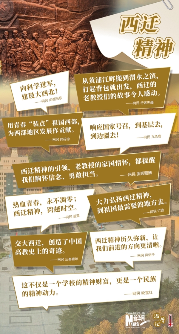 “永遠(yuǎn)向上的精神火焰”系列網(wǎng)評之四十一: 在西安交通大學(xué)西遷博物館里,一張粉紅色的火車票極其別致?;疖嚻鄙厦嬗≈鴷?、墨水瓶,還有一列正在行進(jìn)的火車。正是這張火車票開啟了交大西遷的征程。 1955年,黨中央、國務(wù)院從國家戰(zhàn)略布局和西部工業(yè)發(fā)展需要出發(fā),作出了交通大學(xué)內(nèi)遷西安的決定。從黃浦江畔搬到渭水之濱,交大師生響應(yīng)國家號召,“打起背包就出發(fā)”,舍小家為大家。至1956年9月,包括815名教職工、3900余名學(xué)生在內(nèi)的6000多名交大人匯聚西安,開啟了一段艱苦奮斗的崢嶸歲月。 60余年,一代代交大人在一片荒涼的黃土地上甘于寂寞、樂于奉獻(xiàn),用激情、熱血和青春芳華,鑄就了中國高等教育史上戰(zhàn)略布局調(diào)整的成功范例,并孕育和形成了西遷精神,這不僅是一個學(xué)校的精神財富,更是一個民族的精神動力。 “西遷精神歷久彌新,讓我們前進(jìn)的方向更清晰?!薄拔鬟w精神的引領(lǐng),老教授的家國情懷,都提醒我們胸懷信念、勇敢擔(dān)當(dāng)?!薄瓘木W(wǎng)民們的留言中,我們讀出了一種精神的寶貴和傳承。到黨和國家最需要的地方去!今天,越來越多當(dāng)代青年人接過歷史的接力棒,主動選擇到基層去、到邊疆去,為西部發(fā)展、國家建設(shè)貢獻(xiàn)智慧和力量,用實際行動譜寫著一個又一個新時代的西遷故事。(文字:董璐 海報設(shè)計:王曄)