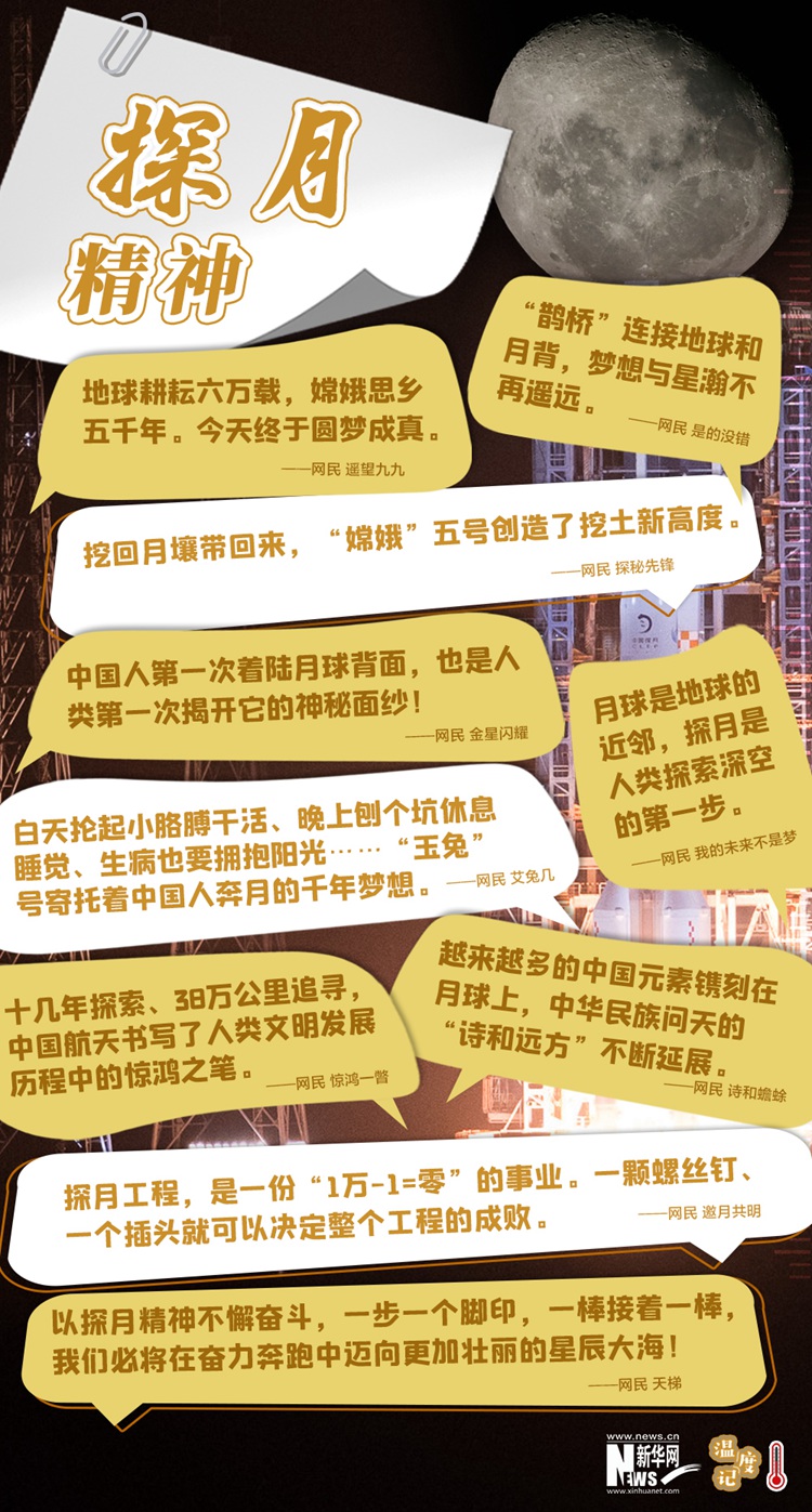 “永遠(yuǎn)向上的精神火焰”系列網(wǎng)評之四十七: “我們終于擁有了自己的月壤!”2020年12月17日凌晨,嫦娥五號返回器攜帶月球樣本成功返回地球,這是21世紀(jì)人類首次月球采樣返回任務(wù)。這一刻,標(biāo)志著我國探月工程“繞、落、回”三步走規(guī)劃圓滿收官,也意味著中國航天事業(yè)又向前邁出一大步。 本世紀(jì)初,我國提出探月“繞、落、回”三步走規(guī)劃。從嫦娥一號繞月探測實(shí)現(xiàn)中華民族千年奔月夢想,到嫦娥二號首次實(shí)現(xiàn)我國對小行星的飛躍探測;從嫦娥三號成功實(shí)現(xiàn)落月夢想,到嫦娥四號實(shí)現(xiàn)人類首次月球背面軟著陸……一次次與月相約的驕人成就背后,是我國無數(shù)追月逐夢的華夏兒女為探索浩瀚宇宙、發(fā)展航天事業(yè)、建設(shè)航天強(qiáng)國邁出的堅(jiān)實(shí)步伐。 探索月球是一份“1萬-1=零”的事業(yè),伴隨著風(fēng)險(xiǎn)、挑戰(zhàn)和未知,一顆螺絲釘、一個(gè)插頭甚至就可以決定整個(gè)工程的成敗。十幾年的探索,38萬公里的追尋,上百家單位、幾萬名科技工作者、解放軍指戰(zhàn)員用心血和智慧實(shí)現(xiàn)了九天攬?jiān)碌囊淮未瓮黄?、一步步跨越,也凝結(jié)了追逐夢想、勇于探索、協(xié)同攻堅(jiān)、合作共贏的探月精神。 星空浩瀚無比,探索永無止境。今天,“嫦娥”奔月、“天問”赴火……中國航天夢想的種子在星際間不斷播撒,探月精神的“詩與遠(yuǎn)方”接續(xù)傳承。“與月亮相約,我們無疑是認(rèn)真的!”正如探月工程總設(shè)計(jì)師、中國工程院院士吳偉仁所說,當(dāng)星際空間探索的接力棒傳到新一代航天人手中,牧星耕宇勇向前,太空筑夢的腳步必將邁得更深、更遠(yuǎn)。(文字:徐可 海報(bào)設(shè)計(jì):王曄)