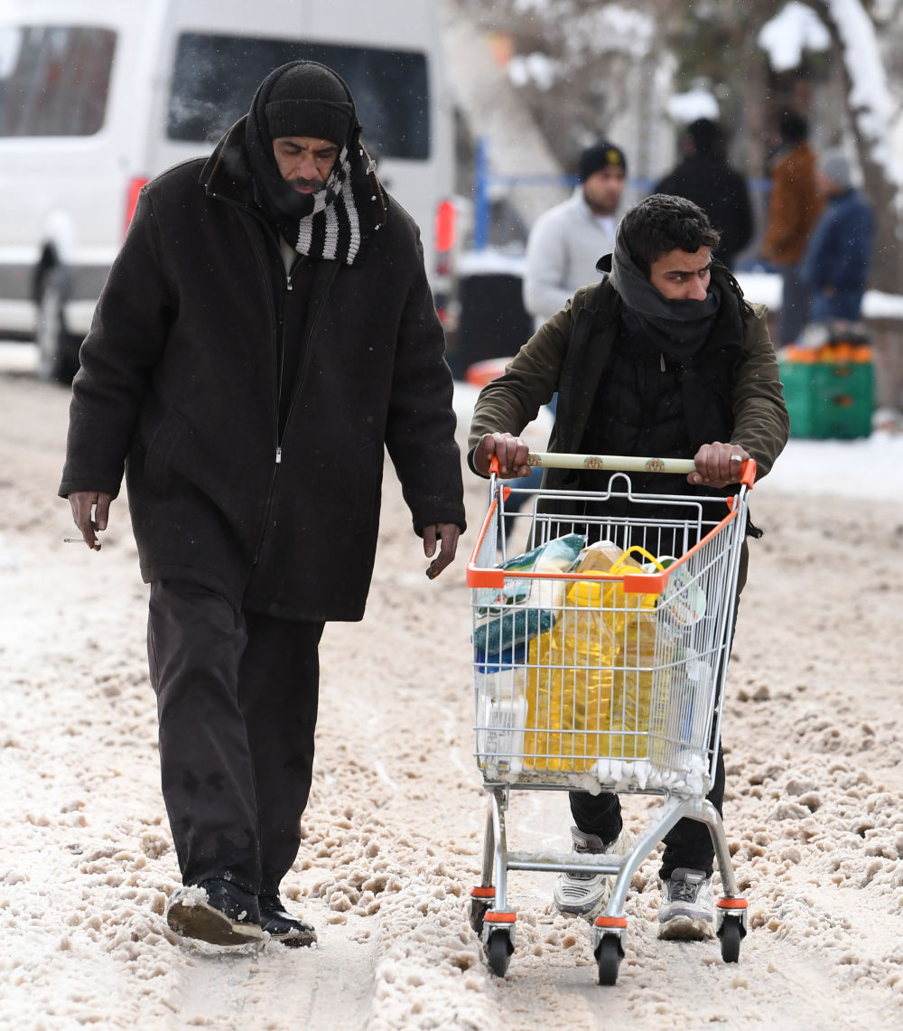 2月7日,在埃爾比斯坦地區(qū),當(dāng)?shù)鼐用裨诮诸^運輸物資。