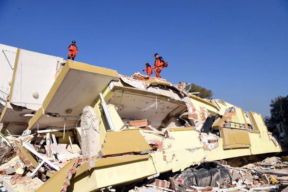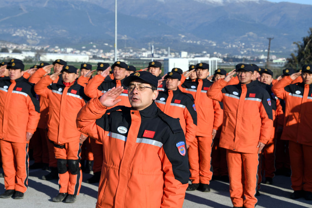 2月8日,中國救援隊隊員在哈塔伊的一處地震廢墟搜救。
