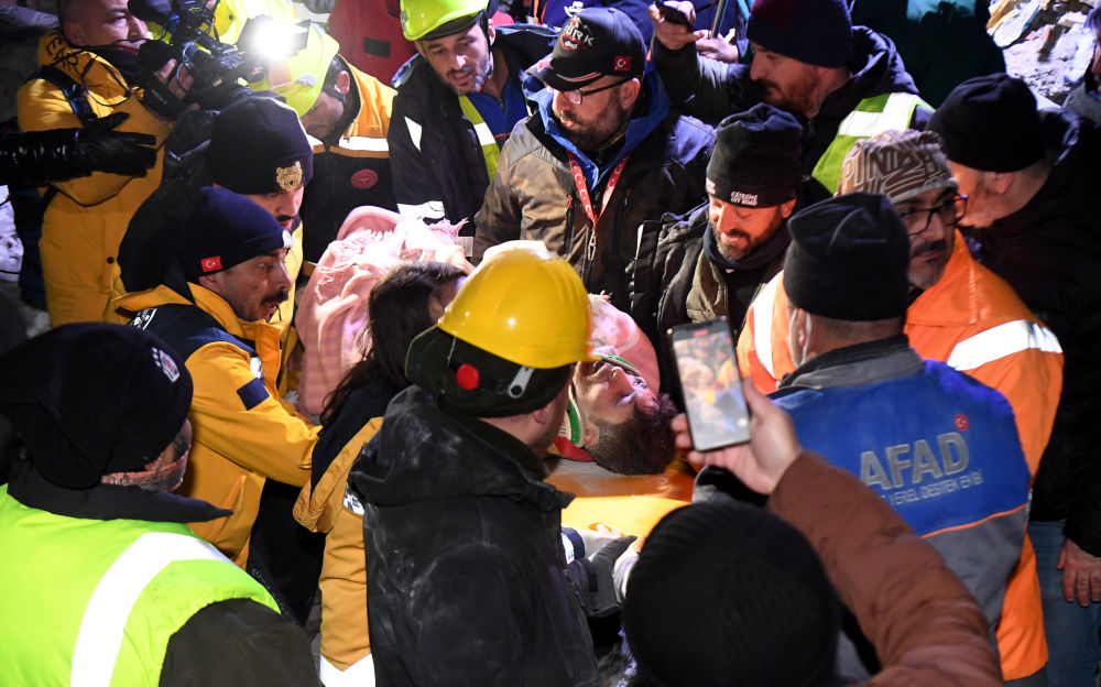 2月7日晚,在埃爾比斯坦地區(qū),救援人員轉(zhuǎn)移地震廢墟中救出的幸存者。