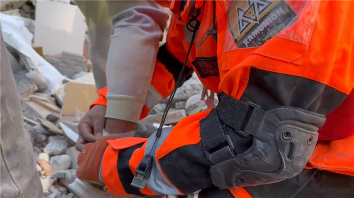 公羊救援隊隊員為土耳其作業(yè)人員現(xiàn)場進行簡易包扎。視頻截圖