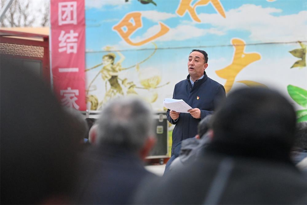 2月20日,在新疆和田地區(qū)策勒縣巴什玉吉買村村委會,買買提依布熱依木·買買提明在升旗儀式后為村民宣講惠民政策。新華社記者 丁磊 攝