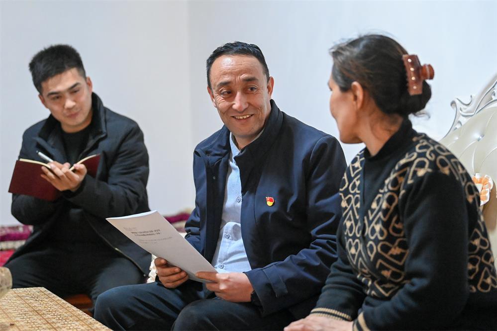 2月20日,新疆和田地區(qū)策勒縣巴什玉吉買村黨支部書記買買提依布熱依木·買買提明(中)在村民家走訪。新華社記者 丁磊 攝
