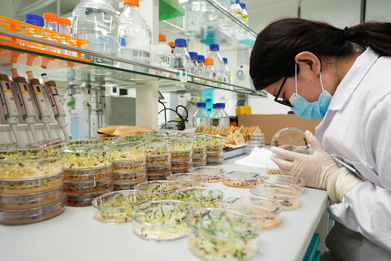 2022年4月11日,海南三亞崖州灣科技城的崖州灣種子實(shí)驗(yàn)室,科研人員正在觀察種子樣本。