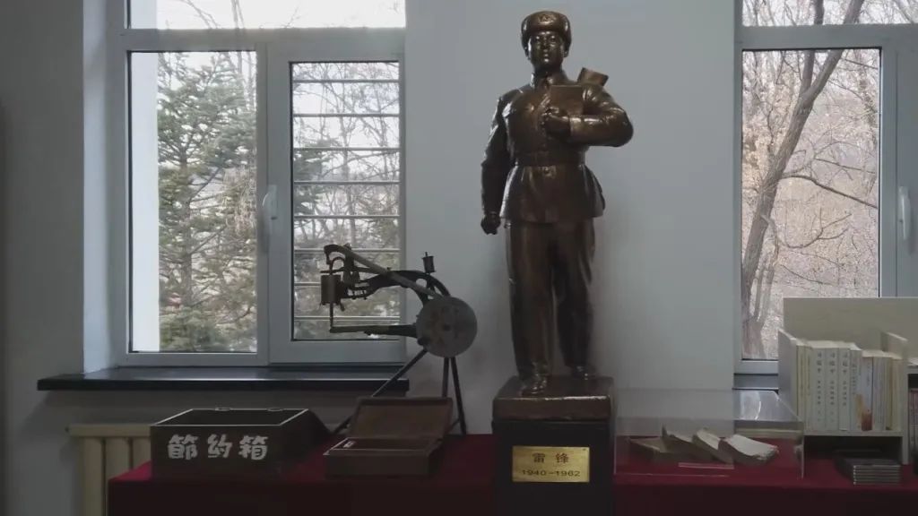 “雷鋒班”宿舍中擺放著雷鋒塑像,旁邊是“雷鋒班”過去常用的“三件寶”:修鞋機、理發(fā)箱和節(jié)約箱。當(dāng)年,戰(zhàn)士們經(jīng)常走街串巷,義務(wù)為居民們修鞋、理發(fā),留下了一段佳話。