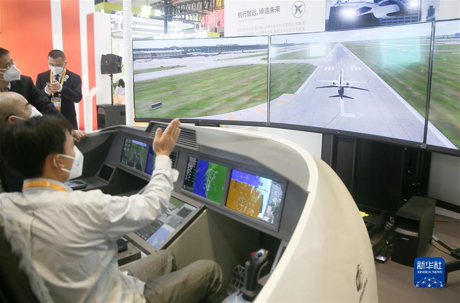 2022年11月5日,在第五屆進(jìn)博會(huì)技術(shù)裝備展區(qū)霍尼韋爾展臺(tái),參觀者在工作人員指導(dǎo)下體驗(yàn)?zāi)M飛行。新華社記者 張可任 攝
