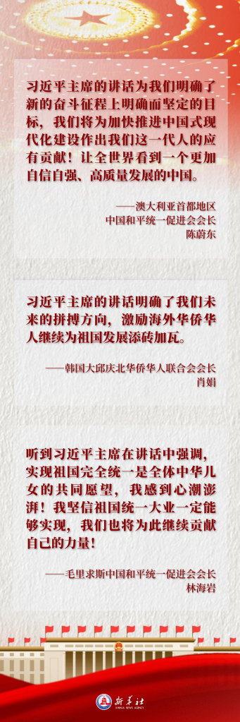 堅(jiān)守人民立場(chǎng)、堅(jiān)定歷史自信、彰顯使命擔(dān)當(dāng)、指引前進(jìn)方向,習(xí)近平主席重要講話讓身在海外的華僑華人信心倍增。他們紛紛表示,強(qiáng)國(guó)建設(shè)、民族復(fù)興的宏偉目標(biāo)催人奮進(jìn),海外中華兒女要凝聚智慧和力量,充分發(fā)揮身在海外的優(yōu)勢(shì),做好中國(guó)與世界各國(guó)之間的橋梁紐帶,為書(shū)寫(xiě)全面建設(shè)社會(huì)主義現(xiàn)代化國(guó)家、全面推進(jìn)中華民族偉大復(fù)興的絢麗篇章添磚加瓦、增光添彩。