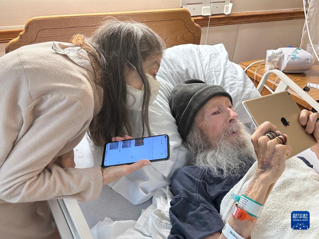 7月2日,103歲的美國(guó)老人林恩·柏齡(右)在其家附近的康養(yǎng)中心病床上,以視頻連線的方式“重回”了他魂?duì)繅?mèng)繞87年的鼓嶺。新華社記者 楊士龍 攝