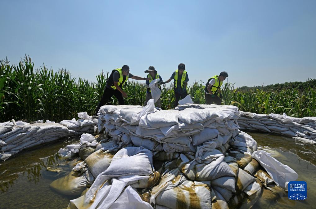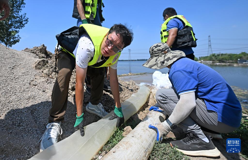 8月15日,應(yīng)急搶險隊在天津市靜海區(qū)臺頭鎮(zhèn)清北地區(qū)北圍埝上調(diào)整抽水袋。