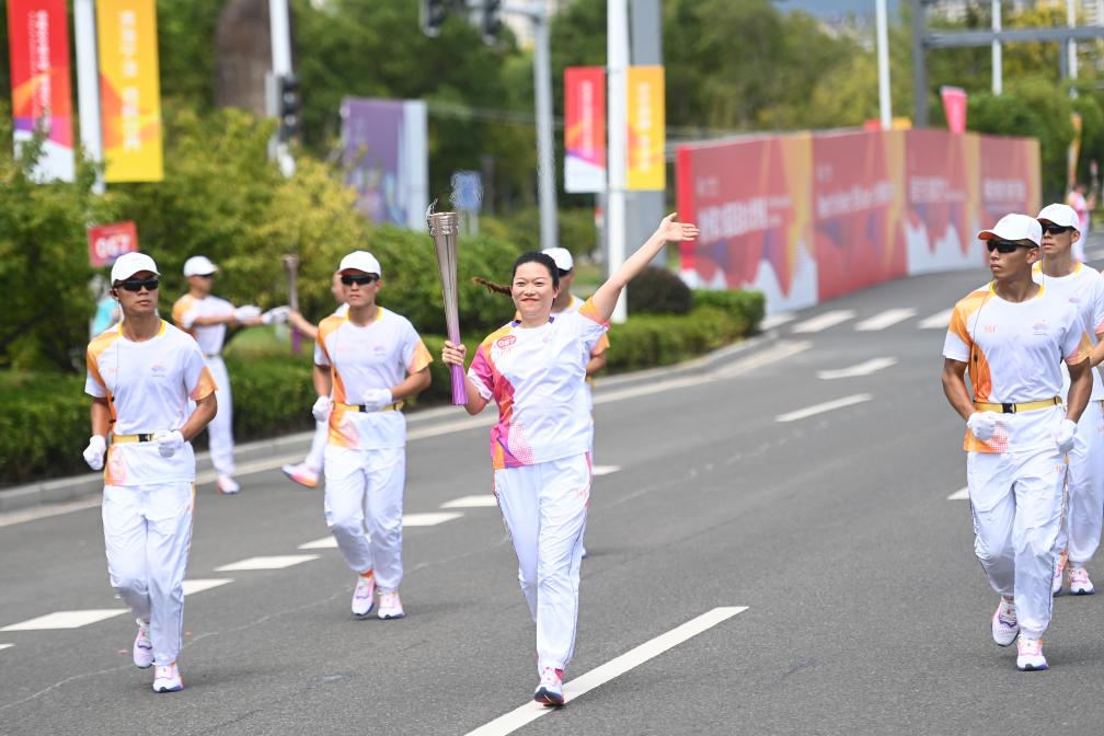 9月8日,火炬手羅雪娟在火炬?zhèn)鬟f中。當(dāng)日,杭州亞運(yùn)會(huì)火炬?zhèn)鬟f在杭州西湖涌金公園廣場(chǎng)啟動(dòng)。新華社記者翟健嵐攝