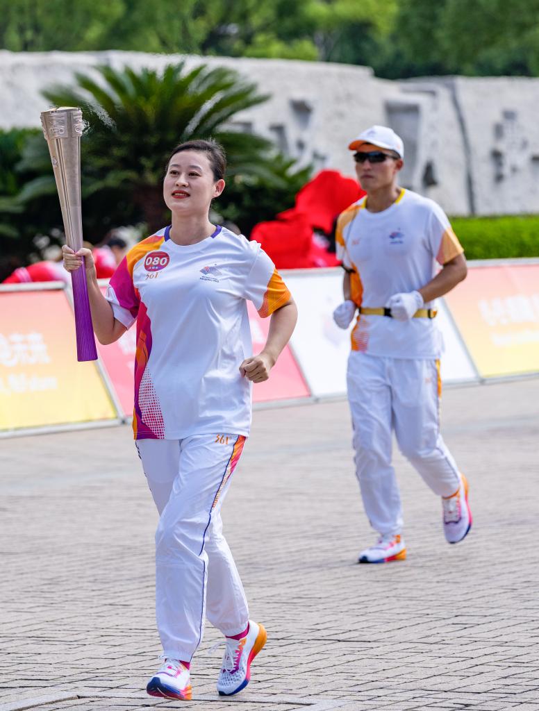 9月10日,火炬手袁晶在火炬?zhèn)鬟f中。當(dāng)日,杭州亞運(yùn)會(huì)火炬在浙江省嘉興傳遞。新華社記者孫非攝