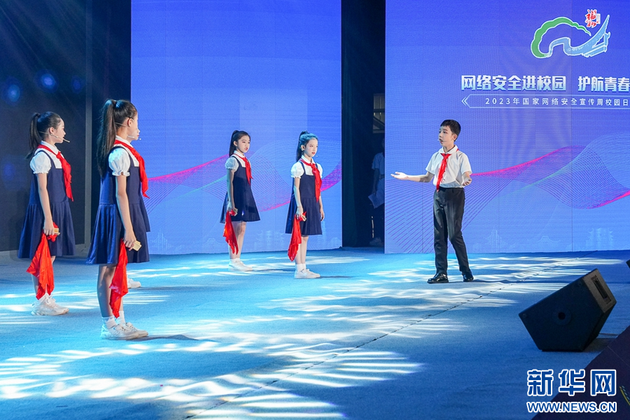 9月12日,校園日活動啟動儀式上,學生表演“文明凈網”主題音樂快板節(jié)目。新華網 肖和勇 攝