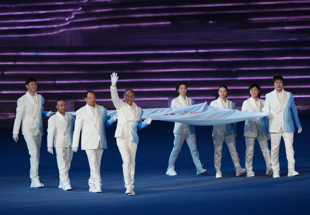 9月23日,中華人民共和國國旗入場。新華社記者 潘昱龍 攝 伴著雄壯的《義勇軍進行曲》,五星紅旗緩緩升起。 20時09分,地屏上勾勒出團扇造型,“梅蘭竹菊”主題之窗開啟,不同國家和地區(qū)的運動員紛至而來。中國以真摯的熱情開門迎客,定格下四海賓朋如約而至的“杭州時刻”。 氣勢宏大的《歌唱祖國》奏響,包括886名運動員在內(nèi)的中國體育代表團最后入場,全場一片歡騰,掌聲歡呼聲此起彼伏。本屆亞運會上,中國健兒將參加38個大項、407個小項的角逐。 從1974年在伊朗首都德黑蘭首次參加亞運會,到亞運金牌數(shù)累計破千,近50年來,中國全社會重視體育、支持體育、參與體育的氛圍愈加濃厚。 光陰荏苒,深情如一。 從北京亞運會的熱烈澎湃,到廣州亞運會的時尚活力,如今的杭州亞運會用酷炫科技表現(xiàn)中華文化,展現(xiàn)出新時代中國自信自強、蓬勃向上的精神風貌。 錢塘之潮煥新亞運活力 伴隨習近平主席宣布盛會開幕,“數(shù)字焰火”流光溢彩,全場觀眾齊聲高呼,為亞運釋放最熾烈的熱情。 亞奧理事會全部45個成員齊聚本屆亞運賽場,參賽運動員人數(shù)超過12000名,創(chuàng)歷屆之最;比賽項目既有田徑、游泳等奧運大項,也有武術(shù)、藤球、板球、克柔術(shù)等代表亞洲不同地域體育文化的特色項目,還有首次成為亞運會正式項目的霹靂舞等。多元包容,青春洋溢,有著70余年歷史的亞洲運動會煥發(fā)出全新活力。 “非常高興亞運會能夠把奧運會新項目納入其中?!鼻皝沓鱿_幕式的國際奧委會主席托馬斯·巴赫相信,杭州亞運會將成功精彩,促進亞洲的團結(jié)與友誼。 音樂響起,8名中國運動員、教練員代表共執(zhí)亞奧理事會會旗入場。伴隨著亞奧理事會會歌,會旗緩緩上升,在杭州高高飄揚。