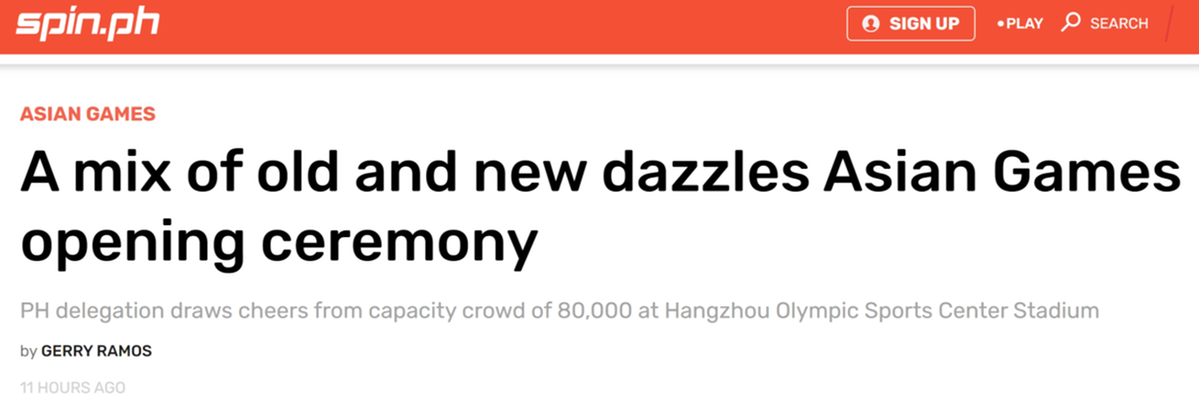 菲律賓體育互動新聞網(wǎng)(SPIN)報道稱,杭州亞運會于周六晚上在座無虛席的杭州奧體中心體育場舉行了令人目炫的開幕式。 豐富的中國文化融入現(xiàn)代科技,節(jié)目持續(xù)約兩個小時,采用數(shù)字科技,在傳統(tǒng)的主火炬點燃時,一個巨大的數(shù)字動畫火炬手同奧運游泳冠軍汪順共同點燃了圣火。
