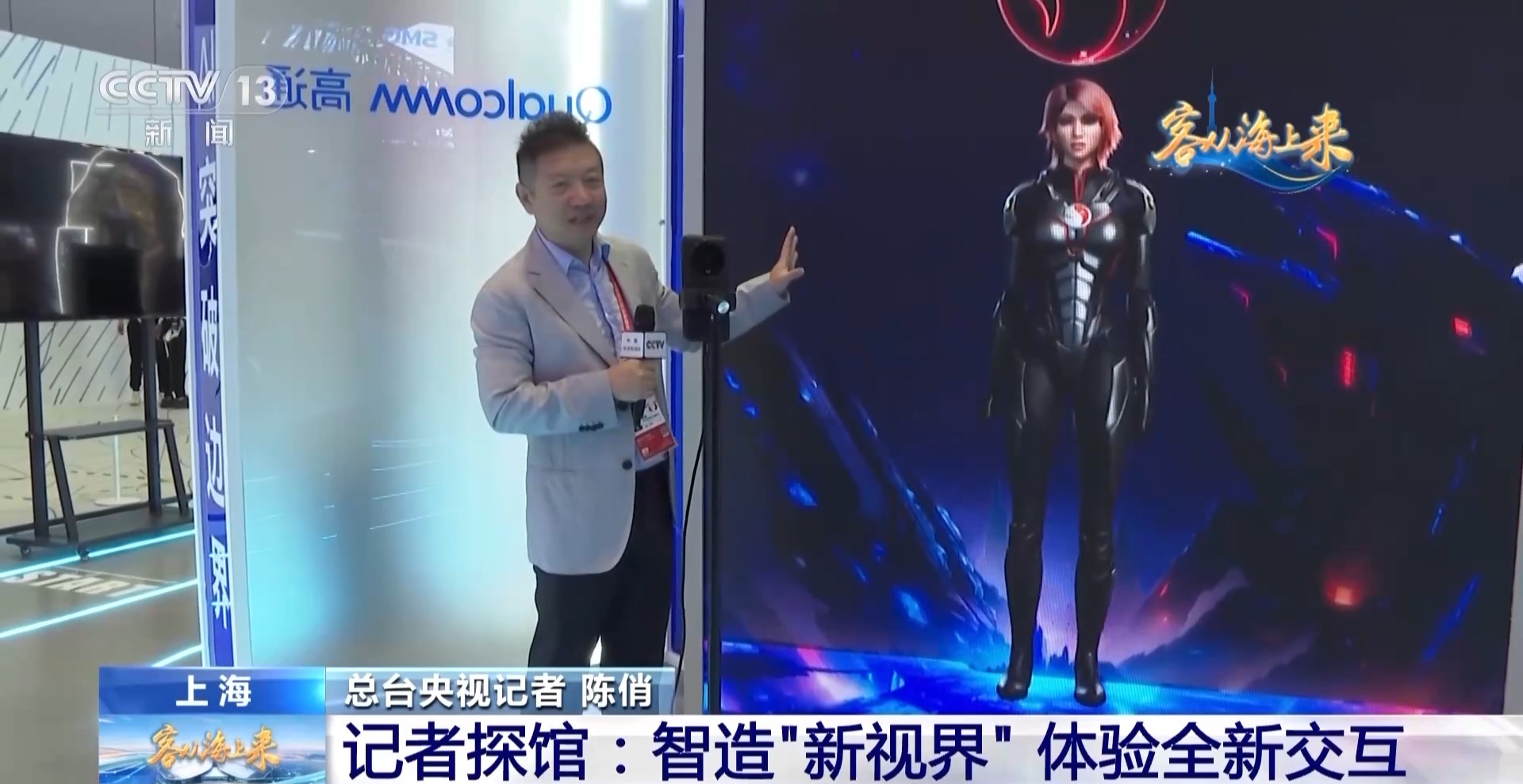 總臺央視記者 陳俏:現(xiàn)在我站在了一個虛擬世界展示的舞臺上,你看到我身邊的屏幕上顯示的數(shù)字人,她可以模仿我的表情,我笑了,她也笑了。她也可以模仿我的動作,比如說我在招手,或者是我在跳舞,這種表情動作她都可以模仿,在這個舞臺上可以展現(xiàn)我在虛擬世界的形象。