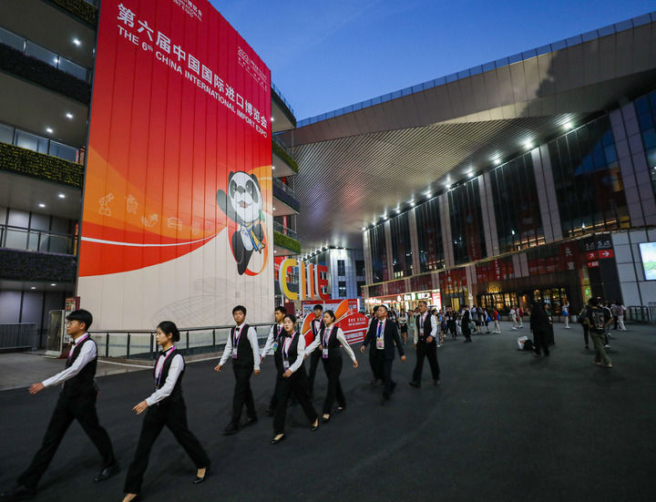 11月5日,工作人員在國家會展中心(上海)經(jīng)過第六屆進(jìn)博會巨幅海報。新華社記者 辛夢晨 攝