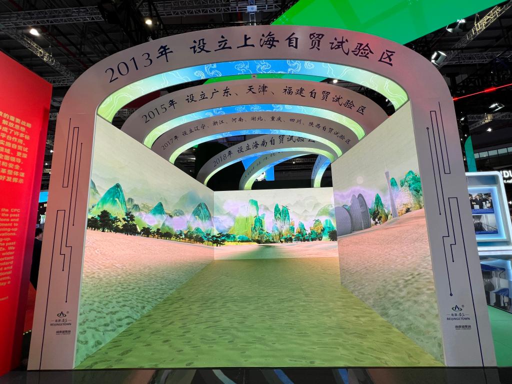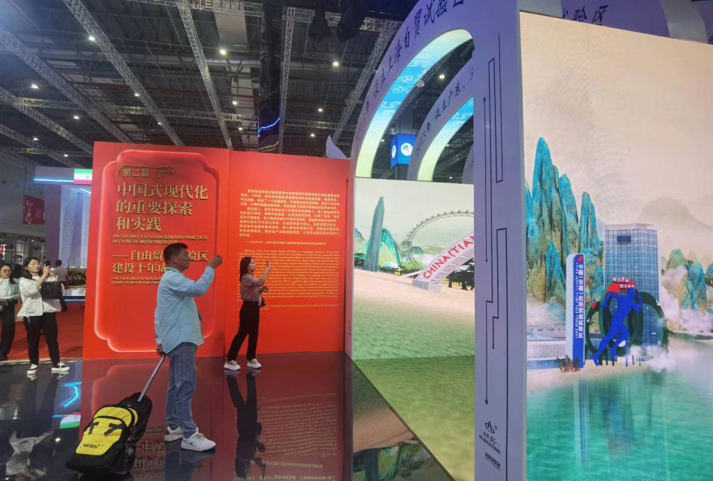 這是正在國(guó)家會(huì)展中心(上海)舉辦的第六屆中國(guó)國(guó)際進(jìn)口博覽會(huì)國(guó)家綜合展的一個(gè)特別部分“中國(guó)式現(xiàn)代化的重要探索和實(shí)踐——自由貿(mào)易試驗(yàn)區(qū)建設(shè)十年成就展”。它位于中國(guó)國(guó)家館內(nèi),通過(guò)高清視頻、珍貴照片、實(shí)物模型等,講述中國(guó)各地自貿(mào)試驗(yàn)區(qū)建設(shè)的改革開(kāi)放故事。