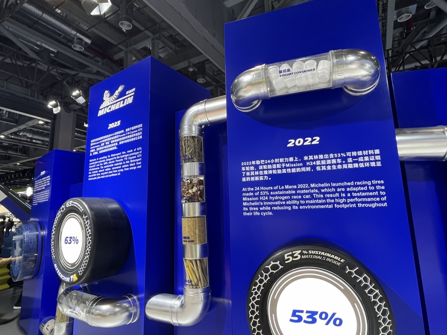選手和“教練”能夠?qū)崿F(xiàn)流暢對話,實(shí)際上就是依靠今年爆火的自然語言處理技術(shù)。隨著人工智能學(xué)科的不斷進(jìn)步,十年間歐姆龍乒乓球教練機(jī)器人變得越來越智能,越來越“懂你”。 “第一代乒乓球機(jī)器人連回球都是一個很吃力的事情,而且經(jīng)常會出故障,那個時候真的有點(diǎn)‘傻’?!眲钥』貞?,機(jī)器人升級到第二代、第三代,可以順暢地接球,但仍然是一個“業(yè)余選手”。 隨著自動化技術(shù)的不斷進(jìn)步,機(jī)器學(xué)習(xí)的不斷深入,今天,第八代乒乓球機(jī)器人已經(jīng)可以和奧運(yùn)冠軍進(jìn)行切磋。奧運(yùn)冠軍陳玘在現(xiàn)場體驗后表示,這臺乒乓球教練機(jī)器人已經(jīng)可以達(dá)到青少年冠軍的相同水平。 零部件越來越“綠色” 如果說技術(shù)裝備館致力于實(shí)現(xiàn)“人機(jī)融合”,那么在更多進(jìn)博的場館中,人與自然的融合則蔚然成風(fēng)。從細(xì)微做起,許多進(jìn)博會的展品正在變得越來越“綠色”:消費(fèi)展區(qū),洗發(fā)水的包裝悄悄變成了可回收環(huán)保材質(zhì);醫(yī)療器械展區(qū),生物醫(yī)藥企業(yè)搬出了使用綠電的“碳中和”工廠;食品展區(qū),水果商拿出了瑕疵水果制作的生物皮革…… 本屆進(jìn)博會,米其林帶著其最新一代可持續(xù)材料輪胎亮相展臺,這款輪胎也是進(jìn)博會的明星展品之一。今年9月底,米其林的“綠色輪胎”從盧森堡運(yùn)抵上海浦東國際機(jī)場,經(jīng)上海海關(guān)快速審核后“秒放”通關(guān),順利入境,成為本屆進(jìn)博會首票入境的展品。 自2021年起,這款“綠色輪胎”就開始在進(jìn)博會持續(xù)亮相。當(dāng)年,這款輪胎的可持續(xù)材料含量為46%。到了2022年,含量升到了53%。今年,這款輪胎的可持續(xù)材料含量提高至63%。米其林中國研發(fā)中心總經(jīng)理高德華介紹,這款明星輪胎所使用的可持續(xù)材料包括天然橡膠、廢舊輪胎中回收提取的炭黑、廢鋼中回收的鋼材、以及橙皮、檸檬皮、松香和葵花籽油提取物,專門適配于氫燃料原型賽車Mission H24和保時捷的電動賽車Porsche 718 Cayman GT4 ePerformance。