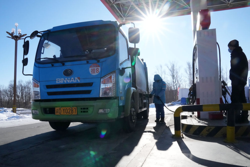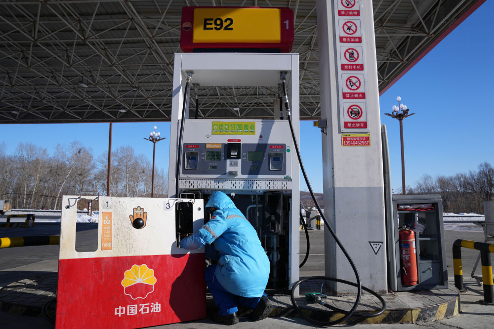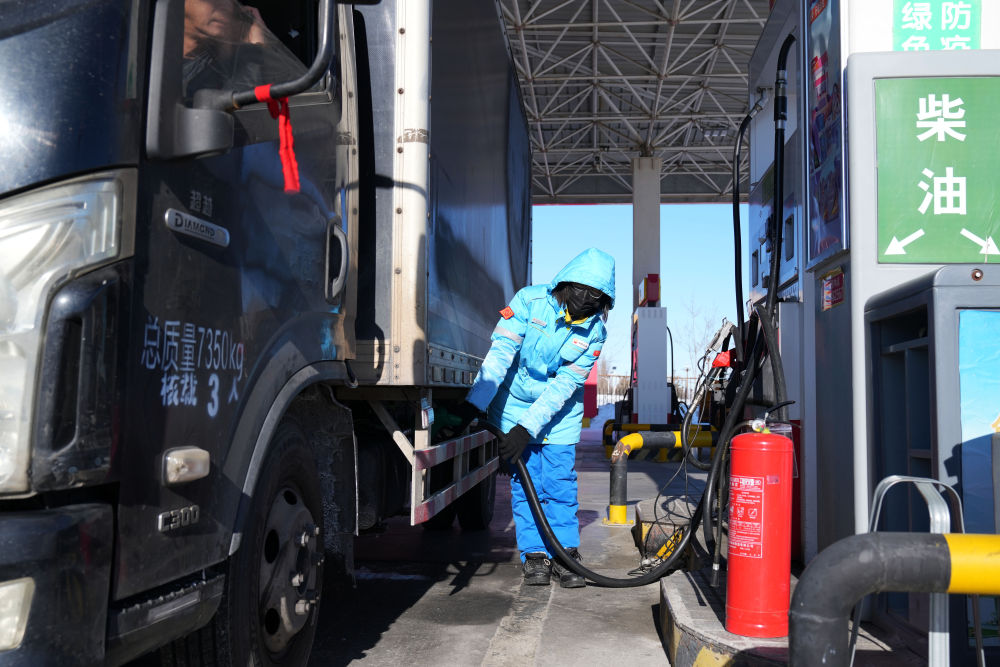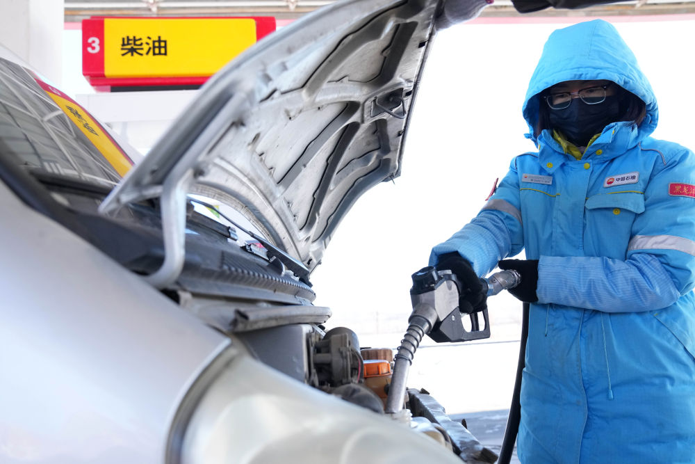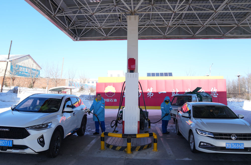 2月2日,中石油黑龍江撫遠東方第一加油站的員工給車輛加油。