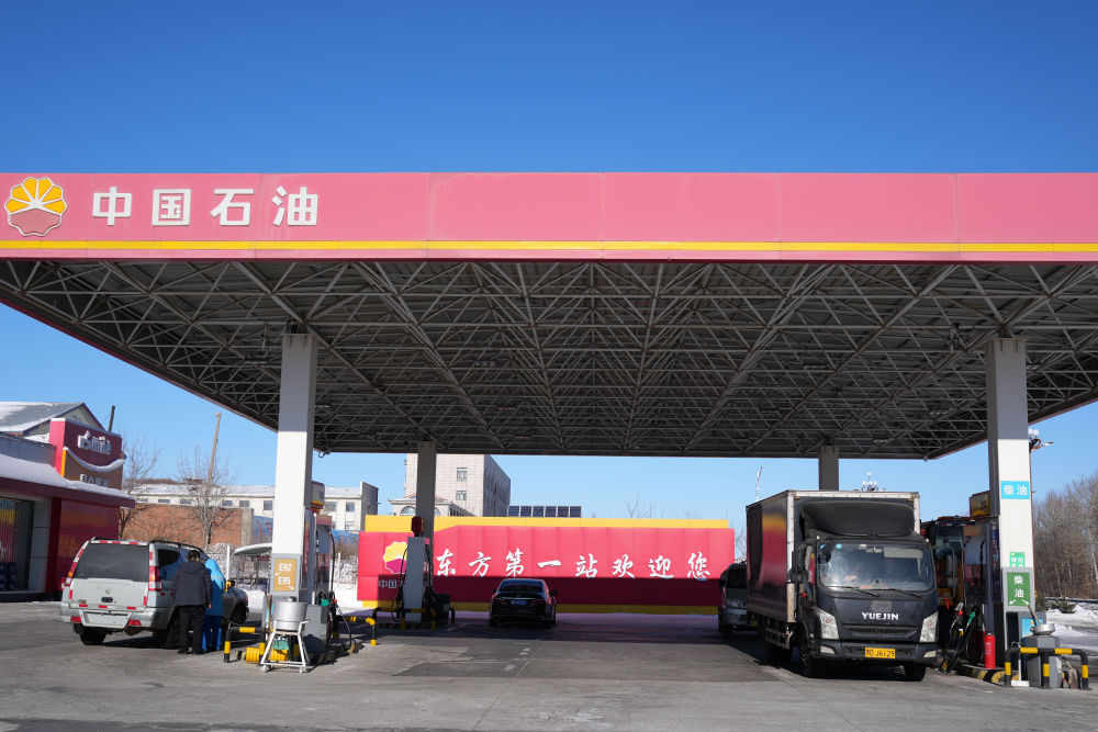2月2日,車輛在中石油黑龍江撫遠東方第一加油站加油(無人機照片)。