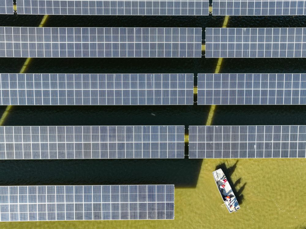 2023年11月17日,在江蘇省連云港市灌云縣圩豐鎮(zhèn)洋橋村,國網(wǎng)連云港供電公司員工對漁光互補發(fā)電項目進行巡檢(無人機照片)。近年來,連云港市積極踐行生態(tài)優(yōu)先、綠色發(fā)展理念,依托地理優(yōu)勢和豐富的光照條件,構(gòu)建清潔低碳、安全高效的新型能源體系,大力發(fā)展光伏、風能等清潔能源,助力綠色低碳發(fā)展。