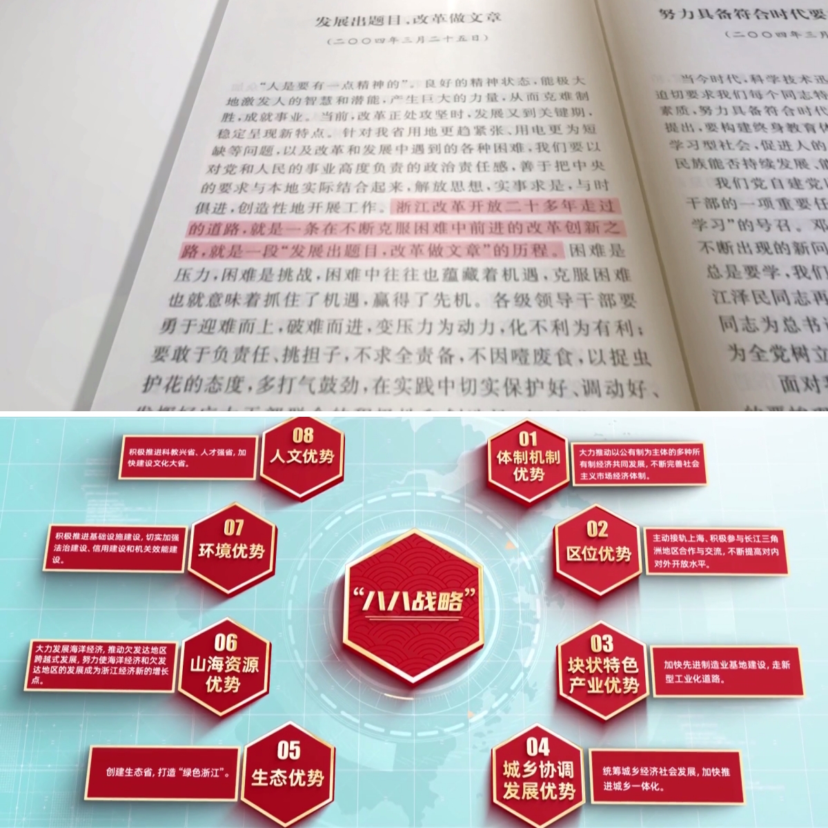 成長的煩惱,如何破解?2004年3月25日,時任浙江省委書記習近平在“之江新語”中,回應了用地緊張、用電短缺等問題,他指出:“浙江改革開放二十多年走過的道路,就是一條在不斷克服困難中前進的改革創(chuàng)新之路,就是一段‘發(fā)展出題目,改革做文章’的歷程。” 針對國有企業(yè)改革難,他五天內(nèi)調(diào)研13家企業(yè)。 針對區(qū)域發(fā)展不平衡,他上高山、入海島。 針對連年攀升的信訪量,他把接待信訪群眾的第一站選在了問題最突出的金華浦江。 奔著問題去,盯著問題改,才能找到改革的突破口。 2003年7月10日,浙江省委十一屆四次全會上,習近平首次系統(tǒng)提出“八八戰(zhàn)略”。
