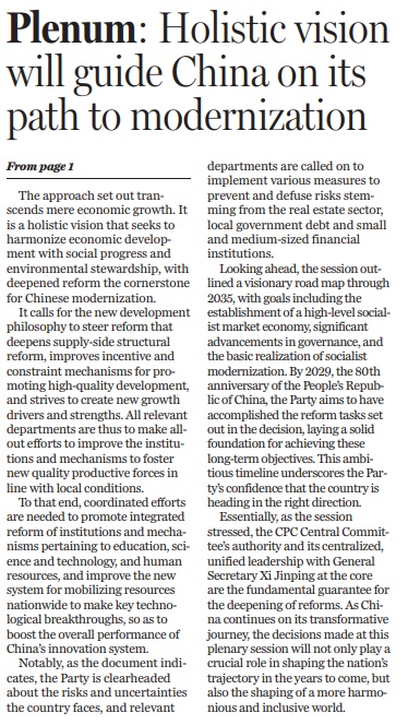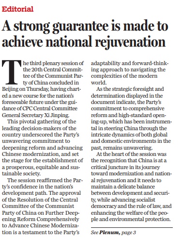 中國(guó)共產(chǎn)黨第二十屆中央委員會(huì)第三次全體會(huì)議于7月15日至18日在北京舉行,對(duì)進(jìn)一步全面深化改革作出系統(tǒng)部署,為國(guó)家未來(lái)發(fā)展指明了方向。 全會(huì)審議通過(guò)了《中共中央關(guān)于進(jìn)一步全面深化改革、推進(jìn)中國(guó)式現(xiàn)代化的決定》,彰顯了我們黨高瞻遠(yuǎn)矚、在嚴(yán)峻復(fù)雜形勢(shì)下將改革進(jìn)行到底的戰(zhàn)略遠(yuǎn)見(jiàn)、堅(jiān)強(qiáng)決心和使命擔(dān)當(dāng)。 當(dāng)前和今后一個(gè)時(shí)期是以中國(guó)式現(xiàn)代化全面推進(jìn)強(qiáng)國(guó)建設(shè)、民族復(fù)興偉業(yè)的關(guān)鍵時(shí)期,必須自覺(jué)把改革擺在更加突出位置,緊緊圍繞推進(jìn)中國(guó)式現(xiàn)代化進(jìn)一步全面深化改革,統(tǒng)籌好發(fā)展和安全,促進(jìn)社會(huì)公平正義,增進(jìn)人民福祉。 全會(huì)確定的方針不僅僅限于經(jīng)濟(jì)增長(zhǎng),而是謀求經(jīng)濟(jì)發(fā)展與社會(huì)進(jìn)步和環(huán)境保護(hù)的協(xié)調(diào)統(tǒng)一。 全會(huì)要求以新發(fā)展理念引領(lǐng)改革,立足新發(fā)展階段,深化供給側(cè)結(jié)構(gòu)性改革,完善推動(dòng)高質(zhì)量發(fā)展激勵(lì)約束機(jī)制,塑造發(fā)展新動(dòng)能新優(yōu)勢(shì)。為此,必須深入實(shí)施科教興國(guó)戰(zhàn)略、人才強(qiáng)國(guó)戰(zhàn)略、創(chuàng)新驅(qū)動(dòng)發(fā)展戰(zhàn)略,統(tǒng)籌推進(jìn)教育科技人才體制機(jī)制一體改革,健全新型舉國(guó)體制,提升國(guó)家創(chuàng)新體系整體效能。 黨對(duì)當(dāng)前面臨的風(fēng)險(xiǎn)和不確定性有清醒認(rèn)識(shí),要求有關(guān)部門落實(shí)好各項(xiàng)措施,防范化解房地產(chǎn)、地方政府債務(wù)、中小金融機(jī)構(gòu)等重點(diǎn)領(lǐng)域風(fēng)險(xiǎn)。 全會(huì)要求到2029年中華人民共和國(guó)成立80周年時(shí),完成《決定》提出的改革任務(wù)。到2035年,全面建成高水平社會(huì)主義市場(chǎng)經(jīng)濟(jì)體制,中國(guó)特色社會(huì)主義制度更加完善,基本實(shí)現(xiàn)國(guó)家治理體系和治理能力現(xiàn)代化,基本實(shí)現(xiàn)社會(huì)主義現(xiàn)代化,為到本世紀(jì)中葉全面建成社會(huì)主義現(xiàn)代化強(qiáng)國(guó)奠定堅(jiān)實(shí)基礎(chǔ)。這一雄心勃勃的時(shí)間表彰顯了黨對(duì)國(guó)家正朝著正確方向前進(jìn)的信心。 從根本上講,正如全會(huì)所強(qiáng)調(diào)的,黨的領(lǐng)導(dǎo)是進(jìn)一步全面深化改革、推進(jìn)中國(guó)式現(xiàn)代化的根本保證。 二十屆三中全會(huì)具有重要的歷史意義,全會(huì)的決策不僅將有力推動(dòng)中國(guó)未來(lái)發(fā)展,而且還將推動(dòng)構(gòu)建一個(gè)更加和諧、更加包容的世界。 本文譯自《中國(guó)日?qǐng)?bào)》7月19日社論 原文標(biāo)題:A strong guarantee is made to achieve national rejuvenation