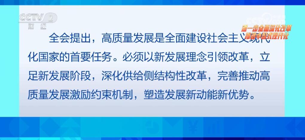 全會(huì)提出,高質(zhì)量發(fā)展是全面建設(shè)社會(huì)主義現(xiàn)代化國(guó)家的首要任務(wù)。必須以新發(fā)展理念引領(lǐng)改革,立足新發(fā)展階段,深化供給側(cè)結(jié)構(gòu)性改革,完善推動(dòng)高質(zhì)量發(fā)展激勵(lì)約束機(jī)制,塑造發(fā)展新動(dòng)能新優(yōu)勢(shì)。要健全因地制宜發(fā)展新質(zhì)生產(chǎn)力體制機(jī)制,健全促進(jìn)實(shí)體經(jīng)濟(jì)和數(shù)字經(jīng)濟(jì)深度融合制度,完善發(fā)展服務(wù)業(yè)體制機(jī)制,健全現(xiàn)代化基礎(chǔ)設(shè)施建設(shè)體制機(jī)制,健全提升產(chǎn)業(yè)鏈供應(yīng)鏈韌性和安全水平制度。