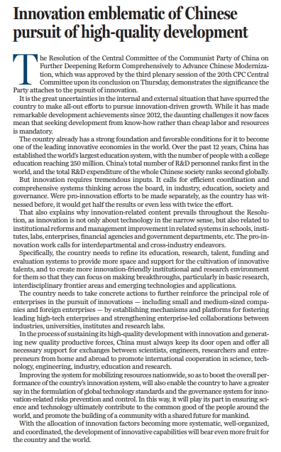 7月18日,中國共產(chǎn)黨第二十屆中央委員會(huì)第三次全體會(huì)議在北京勝利閉幕,全會(huì)審議通過了《中共中央關(guān)于進(jìn)一步全面深化改革、推進(jìn)中國式現(xiàn)代化的決定》(以下簡稱《決定》),其中的相關(guān)內(nèi)容展現(xiàn)了黨對持續(xù)推進(jìn)創(chuàng)新的重視與決心。