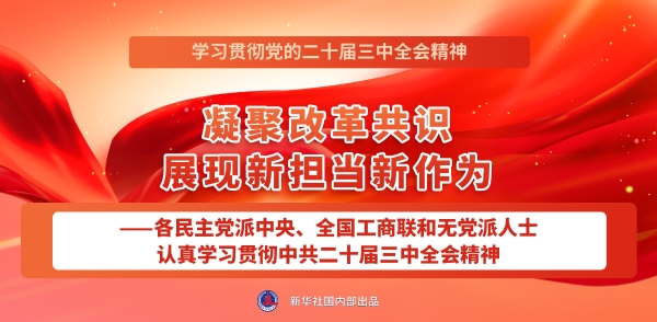 黨的二十屆三中全會7月15日至18日在北京舉行。會議審議通過了《中共中央關于進一步全面深化改革、推進中國式現(xiàn)代化的決定》。新華社記者深入采訪社會各界人士,自7月18日起推出系列報道,生動展現(xiàn)全黨全軍全國各族人民掀起學習貫徹全會精神熱潮,凝心聚力、奮發(fā)進取,以進一步全面深化改革開辟中國式現(xiàn)代化廣闊前景的決心和信心。 點擊標題看詳情:把握歷史主動,在新征程上繼續(xù)把改革推向前進——與會同志談黨的二十屆三中全會精神 點擊標題看詳情:銳意改革進取,開辟中國式現(xiàn)代化廣闊前景——與會同志談黨的二十屆三中全會精神 點擊標題看詳情:高舉改革開放旗幟 推進強國復興偉業(yè)——中央和國家機關、人民團體深入學習貫徹黨的二十屆三中全會精神 點擊標題看詳情:凝聚力量抓落實,開創(chuàng)進一步全面深化改革新局面——各地干部群眾掀起學習貫徹黨的二十屆三中全會精神熱潮 點擊標題看詳情:奮發(fā)進取譜新篇 開辟中國式現(xiàn)代化廣闊前景——各地干部群眾掀起學習貫徹黨的二十屆三中全會精神熱潮 點擊標題看詳情:以高質量發(fā)展奮力書寫中國式現(xiàn)代化新篇章——中管企業(yè)、中管金融企業(yè)和中管高校干部職工掀起學習貫徹黨的二十屆三中全會精神熱潮 點擊標題看詳情:深入實施改革強軍戰(zhàn)略,加快推進國防和軍隊現(xiàn)代化——全軍官兵認真學習貫徹黨的二十屆三中全會精神 點擊標題看詳情:凝聚改革共識,展現(xiàn)新?lián)斝伦鳛椤髅裰鼽h派中央、全國工商聯(lián)和無黨派人士認真學習貫徹中共二十屆三中全會精神 |