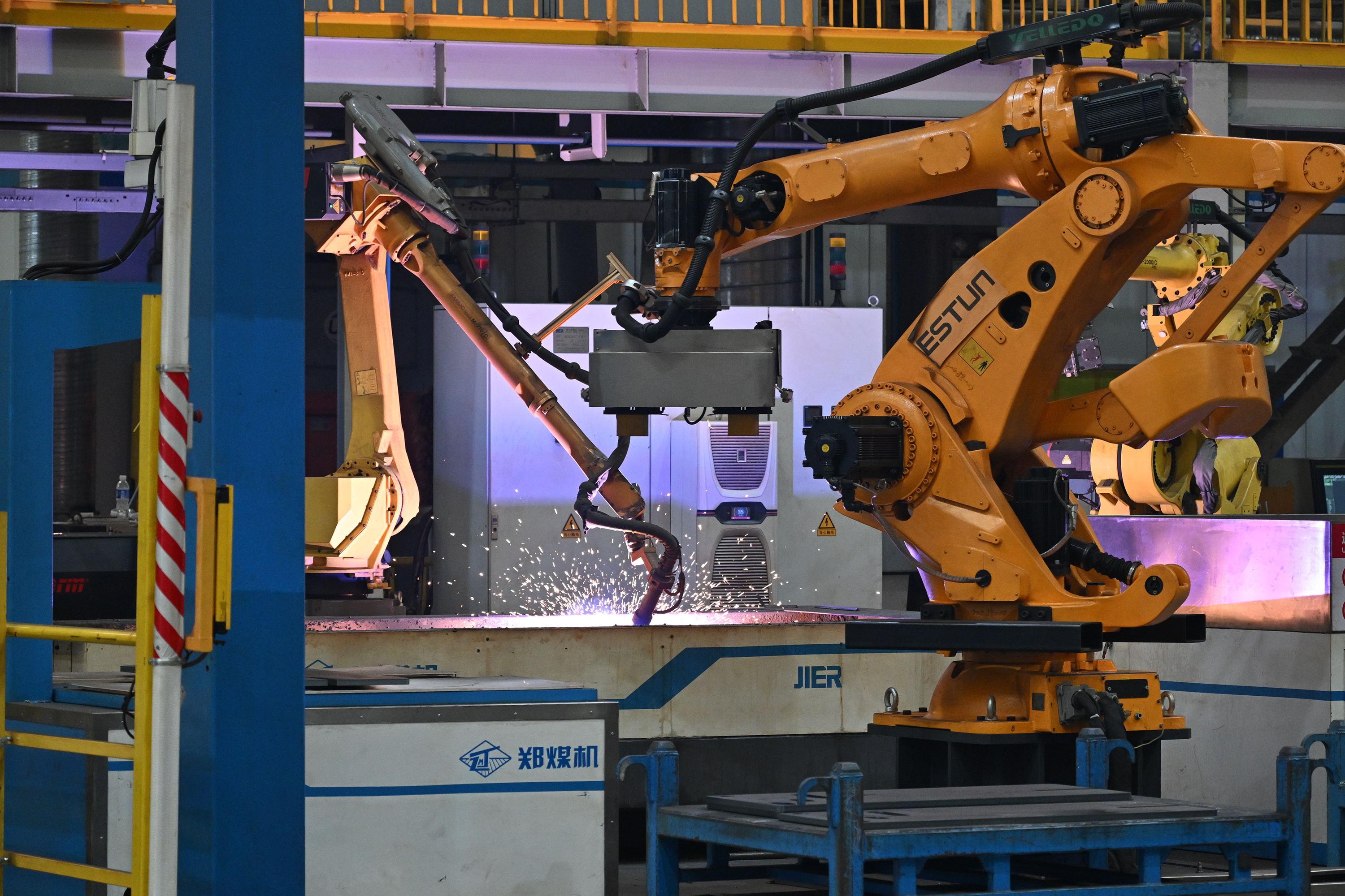 貨車司機把板材運至工廠后,機器人自動從貨車上拾取板材,并按厚度、材質(zhì)等分別堆放至智能倉儲區(qū);依托5G通信系統(tǒng)和物聯(lián)網(wǎng)系統(tǒng),工廠的激光切割生產(chǎn)線、智能焊接生產(chǎn)線,均由機器人完成。