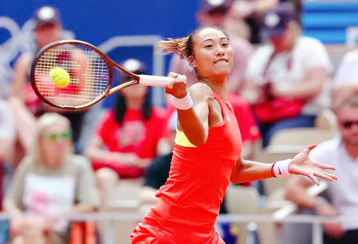 奧運(yùn)網(wǎng)球女單決賽上的鄭欽文(圖源:新華社)