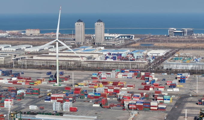 訪客進入中國北方最大港口城市天津的濱海新區(qū),會為高速路上源源不斷的重型卡車和港口堆積如山的集裝箱感到吃驚。