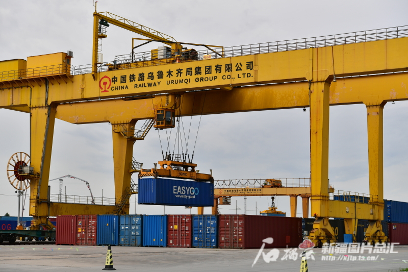 5月29日,霍爾果斯站內(nèi),工作人員操作龍門吊車在吊裝集裝箱。關(guān)擁軍攝