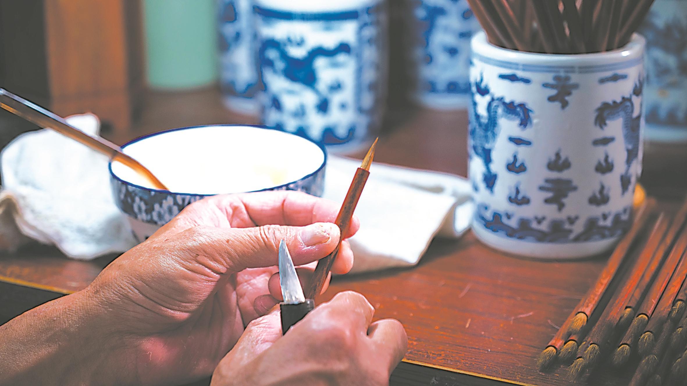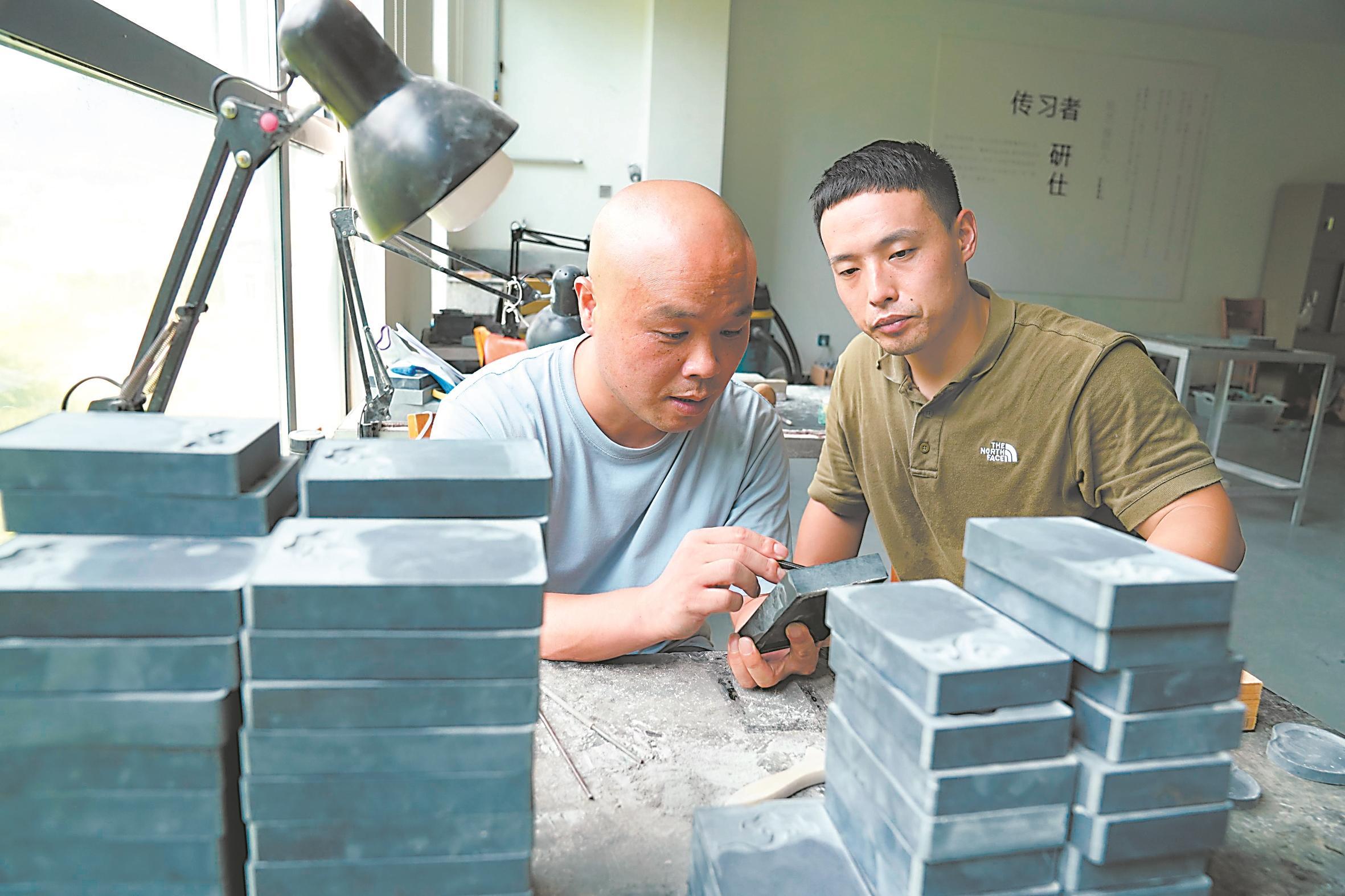 筆 “尖圓齊健”出神韻 7月23日,國(guó)家級(jí)非物質(zhì)文化遺產(chǎn)“宣筆制作技藝”代表性傳承人佘征軍在安徽省非遺傳習(xí)基地展示宣筆制作技藝。 佘征軍在制作宣筆。 7月23日,國(guó)家級(jí)非物質(zhì)文化遺產(chǎn)“宣筆制作技藝”代表性傳承人佘征軍在安徽省非遺傳習(xí)基地展示宣筆制作技藝。 宣筆歷史悠久,源于秦代,盛于唐宋。唐朝在宣城設(shè)宣州總管府,屬制毛筆又主要集中于宣州集散,故因地得名“宣筆”。主要采用山兔毛、山羊毛、黃狼尾毛等為主要原料,經(jīng)過(guò)選料、水盆、制桿、裝套、修筆、鑲嵌、刻字、檢驗(yàn)包裝八大工序一百多個(gè)環(huán)節(jié)沉淀,圍繞“尖圓齊健”四大要領(lǐng),一支柔韌相宜、筆勻基固的宣筆才制作成型。從“手藝人”到“守藝人”,佘征軍在宣筆產(chǎn)品創(chuàng)新的路上不斷探索前進(jìn)。 墨 千錘百煉墨飄香 上圖:7月24日,市級(jí)非物質(zhì)文化遺產(chǎn)“徽墨制作技藝”代表性傳承人胡嘉明在上莊鎮(zhèn)的老胡開(kāi)文墨廠指導(dǎo)員工徽墨古法技藝。下圖:7月24日,市級(jí)非物質(zhì)文化遺產(chǎn)“徽墨制作技藝”代表性傳承人胡嘉明在上莊鎮(zhèn)的老胡開(kāi)文墨廠描金。 7月24日,市級(jí)非物質(zhì)文化遺產(chǎn)“徽墨制作技藝”代表性傳承人胡嘉明在上莊鎮(zhèn)的老胡開(kāi)文墨廠探索徽墨產(chǎn)品創(chuàng)新。 醇煙百煉久,萬(wàn)杵臼中錘。天下墨業(yè),以徽墨為首?;漳珰v史悠久,因產(chǎn)于古徽州府而得名。徽墨原料主要分松煙和油煙兩種,其歷經(jīng)煉煙、洗煙、熬膠、拌料、成胚、捶打、定型、晾墨、打磨、描金、雕刻等十多個(gè)工序,至少幾個(gè)月才能制成光澤如漆的佳墨。上莊鎮(zhèn)上莊村是清代制墨名家胡天柱的故鄉(xiāng),“胡開(kāi)文”即為胡天柱創(chuàng)辦的徽墨墨莊店號(hào)。40年來(lái),胡嘉明潛心研制徽墨,默默堅(jiān)守胡開(kāi)文墨業(yè)的金字招牌,在古法制墨的基礎(chǔ)上不斷探索,利用互聯(lián)網(wǎng)銷售優(yōu)勢(shì),并設(shè)立徽墨研學(xué)體驗(yàn)項(xiàng)目,擔(dān)當(dāng)起了弘揚(yáng)和傳承徽墨文化的責(zé)任。 紙 承載古韻壽千年 7月23日,大國(guó)工匠、全國(guó)五一勞動(dòng)獎(jiǎng)?wù)芦@得者毛勝利和省級(jí)非物質(zhì)文化遺產(chǎn)項(xiàng)目宣紙代表性傳承人汪息發(fā)在現(xiàn)場(chǎng)向游客展示宣紙制作這一承載了徽香墨韻的千年古技。 在“中國(guó)宣紙之鄉(xiāng)”宣城涇縣的中國(guó)宣紙股份有限公司三丈三“超級(jí)宣紙”生產(chǎn)車間里,44名技藝精湛的撈紙工匠齊心協(xié)力共同抬起巨型竹簾制作宣紙。 7月23日,在涇縣中國(guó)宣紙小鎮(zhèn),大國(guó)工匠、全國(guó)五一勞動(dòng)獎(jiǎng)?wù)芦@得者毛勝利和省級(jí)非物質(zhì)文化遺產(chǎn)項(xiàng)目宣紙代表性傳承人汪息發(fā)向游客展示宣紙制作這一承載了徽香墨韻的千年古技。 宣紙,始于唐代,發(fā)源于安徽省宣城市涇縣,距今已有1500余年歷史。青檀樹(shù)皮、沙田稻草,歷經(jīng)清洗、蒸煮、晾曬、揀選、捶搗、切割……108道工序,終成經(jīng)久不脆、吸水潤(rùn)墨、不蛀不腐的千年壽紙。 毛勝利介紹,“水深火熱”是宣紙的兩大關(guān)鍵環(huán)節(jié)?!八睢本褪菗萍垼盎馃帷眲t是曬紙。用竹篾編成的紙簾在漿水中撈提,兩個(gè)撈紙工需要高度協(xié)調(diào),才能保證每張紙的厚薄均勻。曬紙則是撈紙后的一道工序,先將架子上濕漉漉的宣紙揭下來(lái),再將宣紙一張張分開(kāi),“曬”在加熱的鋼板焙面,最后用松針?biāo)⒓埪⑵健?006年,宣紙制作技藝被列入首批國(guó)家級(jí)非遺。2009年,宣紙制作技藝被聯(lián)合國(guó)教科文組織列入人類非物質(zhì)文化遺產(chǎn)代表作名錄。 硯 雕琢之間綻芳華 7月24日,宣城市非物質(zhì)文化遺產(chǎn)宣硯制作技藝傳承人黃瑞正在和宣城市工藝美術(shù)大師張明探討禮品硯臺(tái)的制作。 7月24日,宣城市非物質(zhì)文化遺產(chǎn)宣硯制作技藝傳承人黃瑞正在展示宣硯制作技藝。 7月24日,宣城市非物質(zhì)文化遺產(chǎn)宣硯制作技藝傳承人黃瑞正在和宣城市工藝美術(shù)大師張明探討禮品硯臺(tái)的制作。 宣硯有著悠久的歷史,具有精湛的工藝和卓越的品質(zhì),是宣城市打造“中國(guó)文房四寶之城”不可或缺的板塊。2014年,旌德縣被中國(guó)輕工業(yè)聯(lián)合會(huì)和中國(guó)文房四寶協(xié)會(huì)授予“中國(guó)宣硯之鄉(xiāng)”特色區(qū)域稱號(hào)。近年來(lái),旌德縣按照“創(chuàng)造性轉(zhuǎn)化、創(chuàng)新性發(fā)展”要求,依托宣硯文化賦能產(chǎn)業(yè)發(fā)展,取得了良好成效。 黃瑞介紹,宣硯制作技藝包括采石、選料、設(shè)計(jì)、制坯、雕刻、打磨、銘文、護(hù)養(yǎng)、配盒九大環(huán)節(jié)、40多道工序,每道工序均有詳細(xì)的技術(shù)指標(biāo)和制作要求。2017年,宣硯制作技藝被錄入安徽省非物質(zhì)文化遺產(chǎn)名錄。作為一名傳承人一定守護(hù)好這門手藝,讓它在自己的手中發(fā)揚(yáng)光大。 |