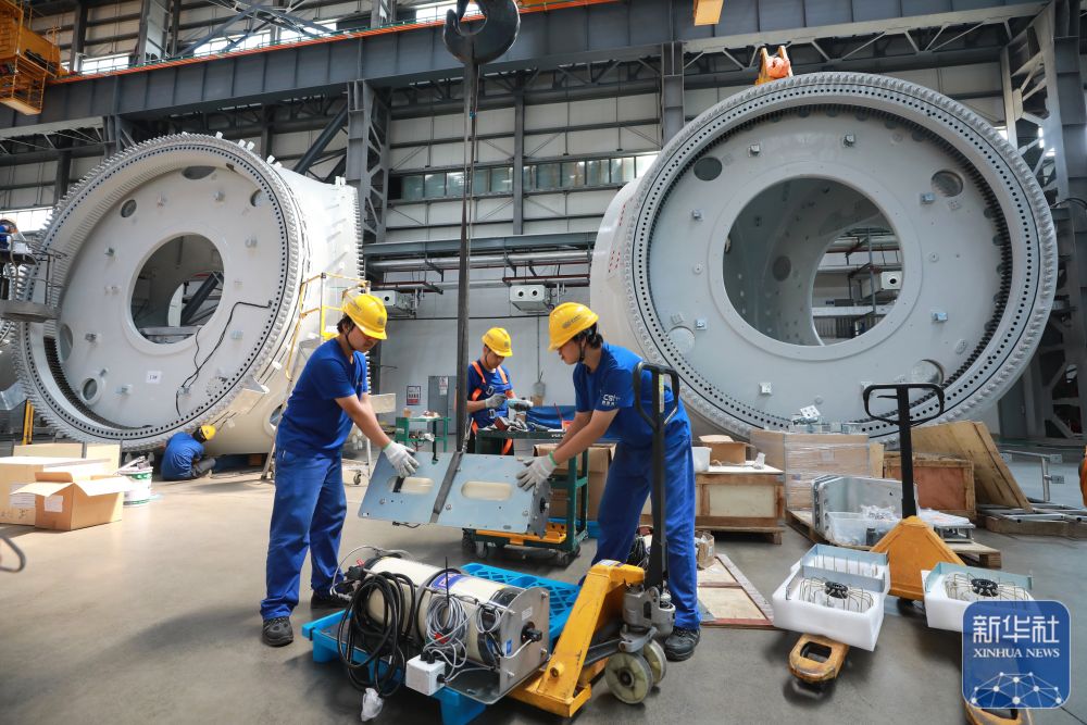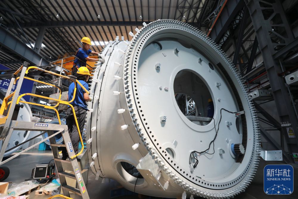 ↑8月8日,在福建三峽海上風(fēng)電國(guó)際產(chǎn)業(yè)園東方電氣風(fēng)電(福建)有限公司的生產(chǎn)現(xiàn)場(chǎng),工人在生產(chǎn)18兆瓦半直驅(qū)海上風(fēng)電機(jī)組。