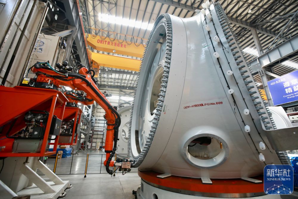 ↑8月8日,在福建三峽海上風(fēng)電國(guó)際產(chǎn)業(yè)園東方電氣風(fēng)電(福建)有限公司的生產(chǎn)現(xiàn)場(chǎng),機(jī)械臂在生產(chǎn)18兆瓦半直驅(qū)海上風(fēng)電機(jī)組。
