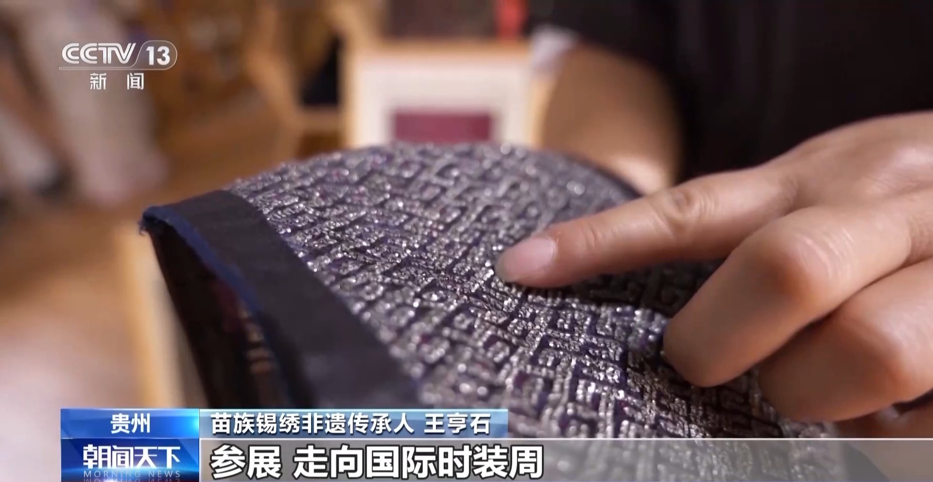 苗族錫繡非遺傳承人 王亨石:按照他要尺寸的大小自己繡出來,繡出來以后寄給他,他自己再設(shè)計(jì)出作品,參展,走向國際時(shí)裝周。我想生在大山里面幾百年的錫繡,今天能走上這么高的國際舞臺,我真的感到很高興而且很自豪。