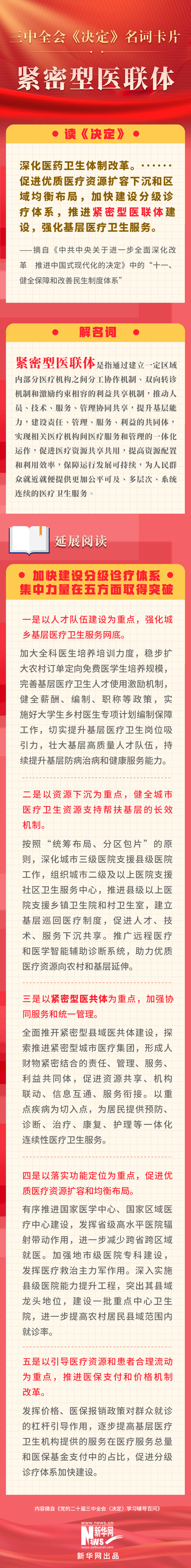 黨的二十屆三中全會審議通過了《中共中央關(guān)于進(jìn)一步全面深化改革、推進(jìn)中國式現(xiàn)代化的決定》。新華網(wǎng)依據(jù)《黨的二十屆三中全會〈決定〉學(xué)習(xí)輔導(dǎo)百問》,制作三中全會《決定》系列名詞卡片,和大家一起來深入學(xué)習(xí)領(lǐng)會二十屆三中全會精神。本期名詞是“緊密型醫(yī)聯(lián)體”。