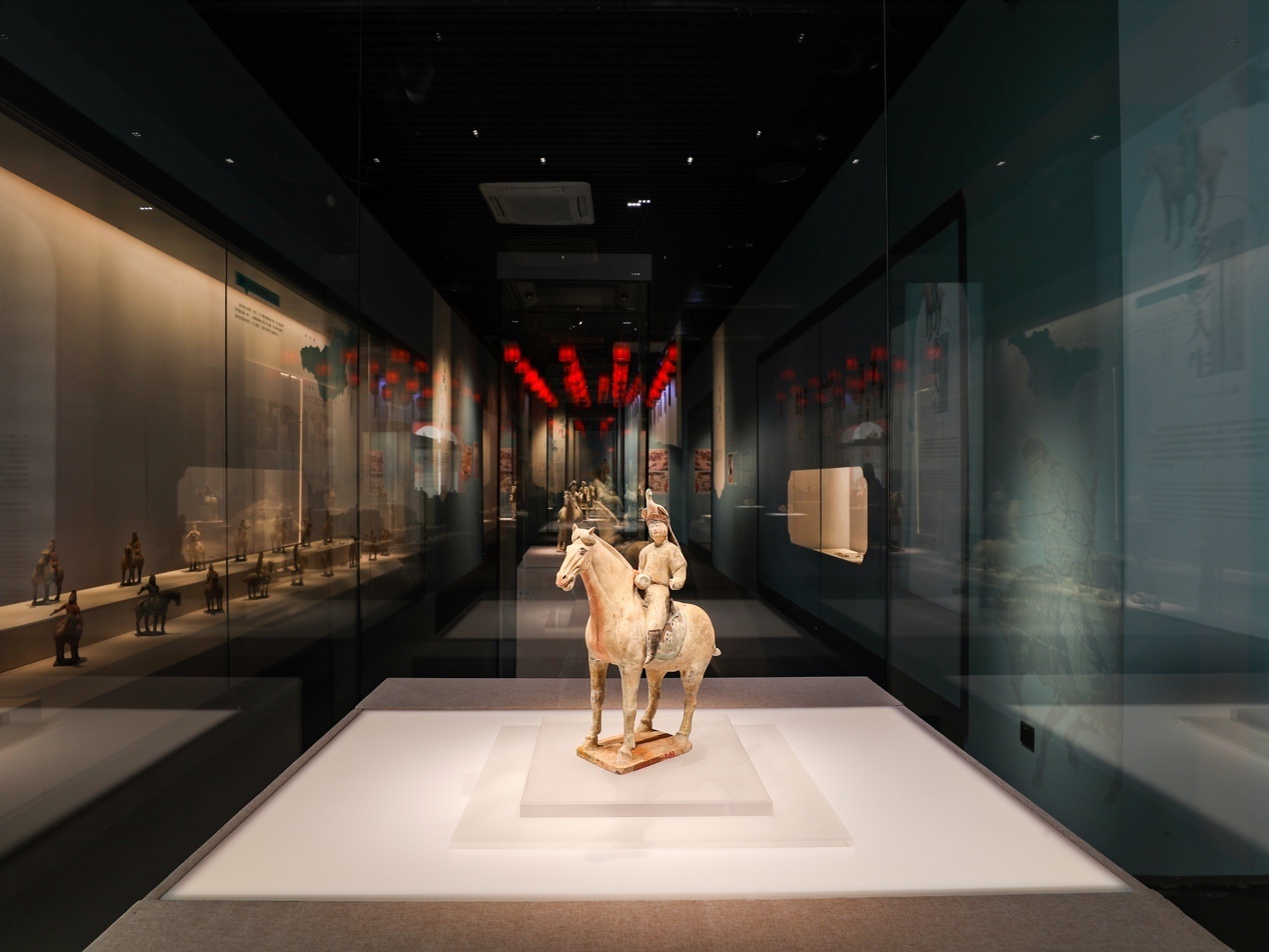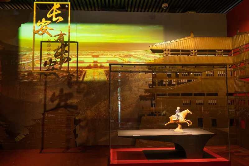 目前,西安博物院博物館內(nèi)展出文物有2000多件。與“帶猞猁狩獵女俑”同樣在館的還有大名鼎鼎的鎮(zhèn)館之寶——唐代三彩騰空馬。西安博物院陳列展覽部部長朱歌敏介紹,去年推出的“長安有故里——絲路少年大唐行”展覽,以鎮(zhèn)館之寶馬背上的藍(lán)衣少年為原型,通過少年在大唐長安游歷的所見、所聞、所感,展現(xiàn)了“大唐金市”“百戲雜技”“狩獵出游”等典型場景,勾勒出唐代多姿多彩的世俗生活百態(tài)。