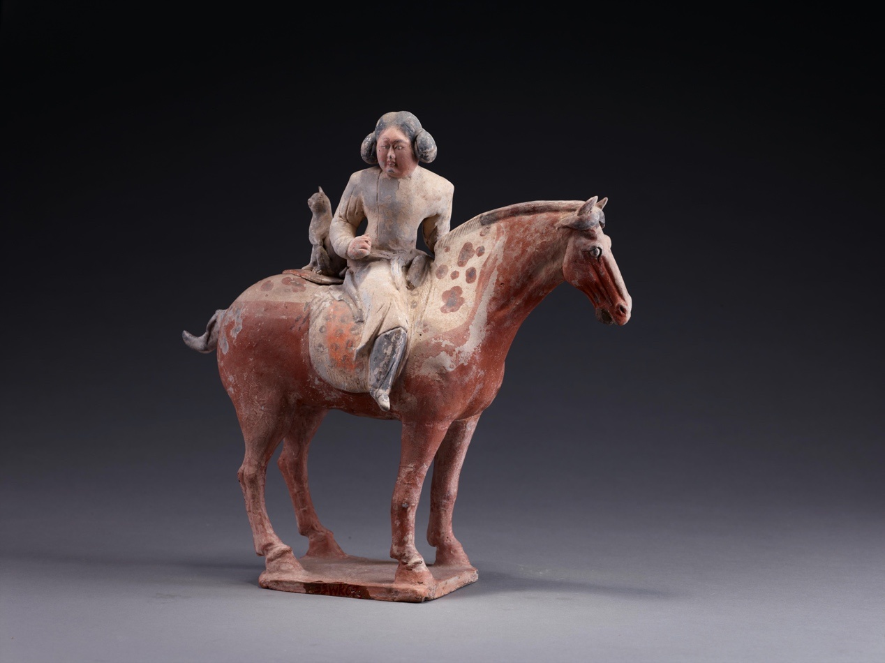 這是一位帶著“喵星人”一起打獵的颯爽英姿的小姐姐。她來自唐代,頭上梳著可愛的雙尾髻,粉面朱唇,細(xì)眉黑目,身穿白色圓領(lǐng)窄袖缺袴袍,足蹬黑色長靴、胯下棗紅馬;她的身體微向右轉(zhuǎn),右手緊握成拳,左手前伸仿佛在控制韁繩,神情自若。最吸引人的是,她身后蹲伏著一只小巧可愛的動物——猞猁,猞猁是一種小型貓科猛獸,在唐代通常經(jīng)過馴養(yǎng),可以成為打獵的“最佳拍檔”。這“一人一馬一猞猁”栩栩如生,靈動跳脫??v馬飛馳而來的她,是怎樣的契機(jī)才得以呈現(xiàn)在世人面前?又折射出唐代怎樣的社會風(fēng)貌呢?